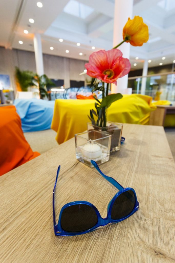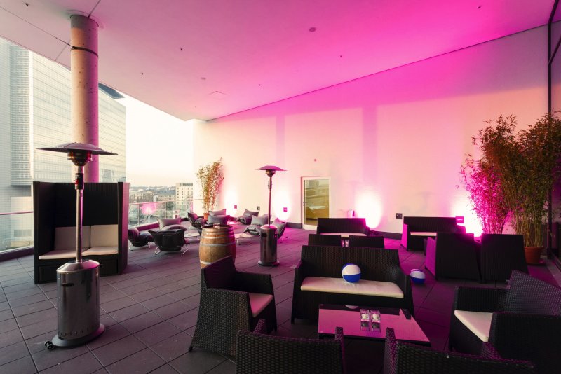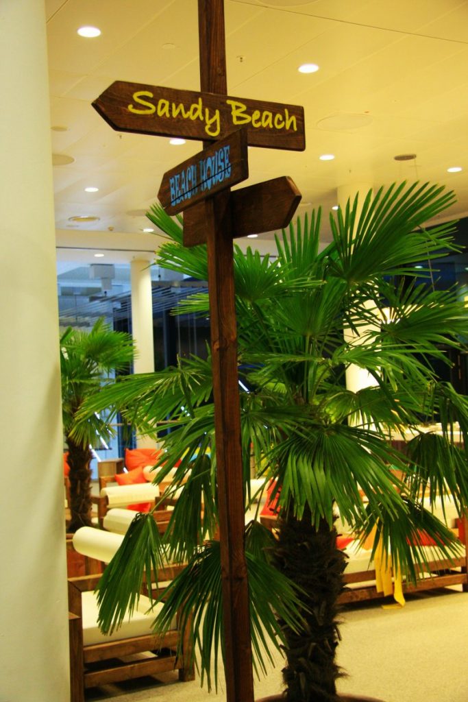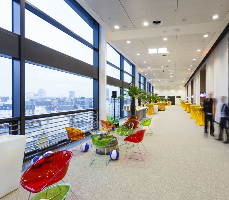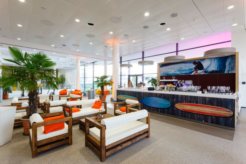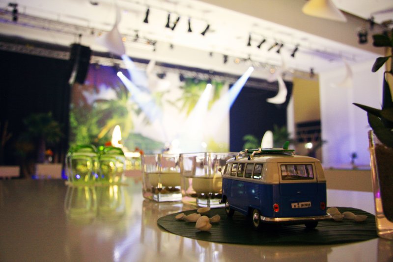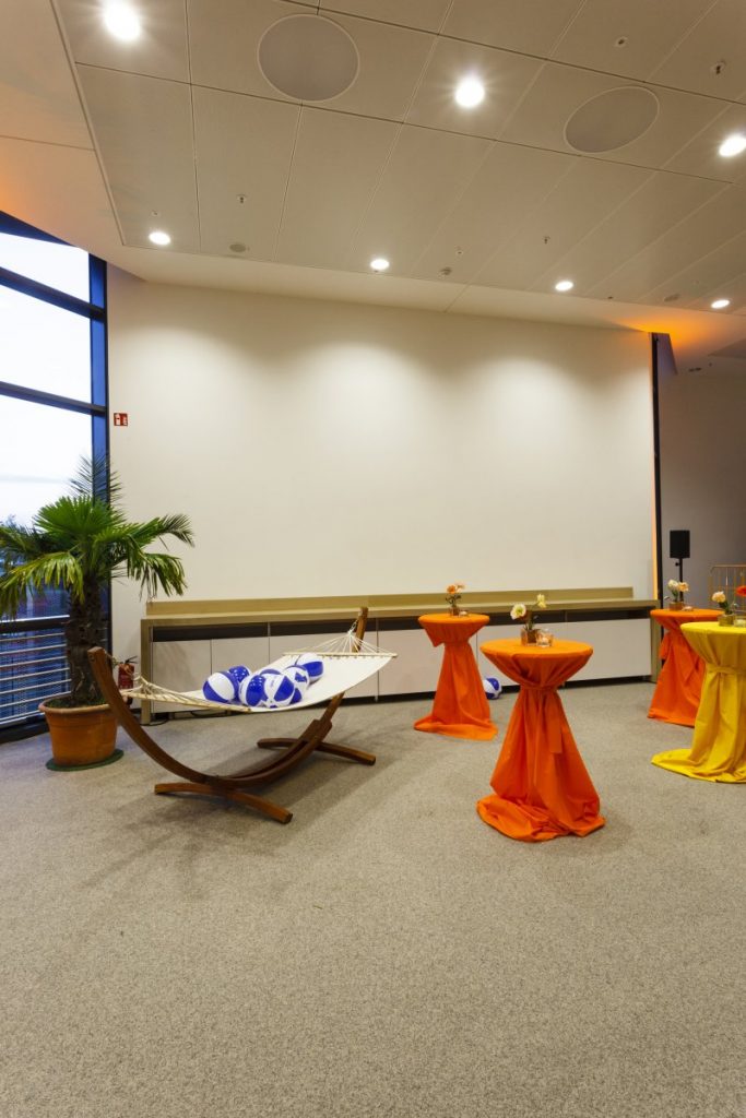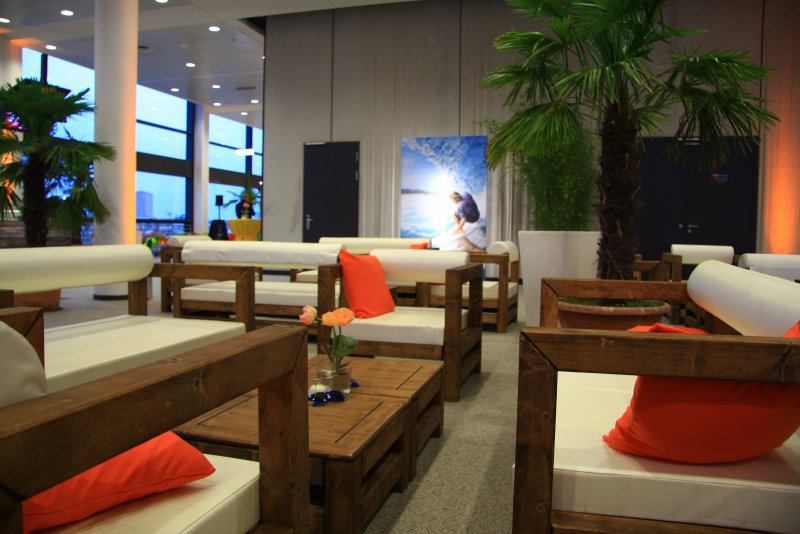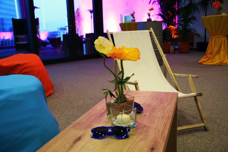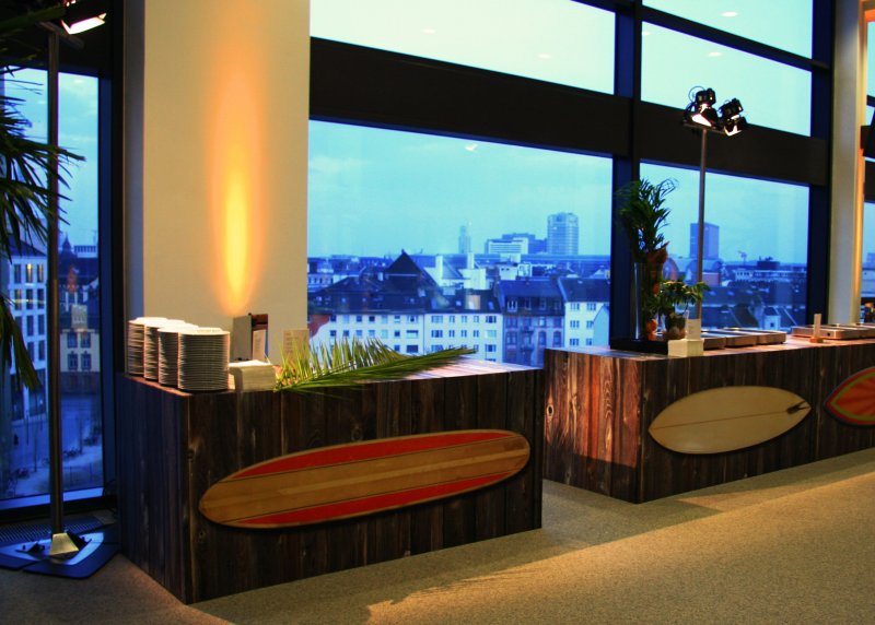 Das Kap Europa verwandelte sich für 600 Gäste in einen kalifornischen Traumstrand. Surfbretter, Hängematten, Palmen und sogar Sonnenbrillen und Strandbälle lagen bereit. Wer es sich auf einer der fröhlich-bunten Begegnungsinseln an der Fensterfront gemütlich gemacht hatte, brauchte nicht viel Fantasie, um sich die Frankfurter Skyline als wogendes Meer und den beigefarbenen Teppichboden als Sandstrand vorzustellen. Zudem unterstrichen coole Surferfotos sowie ein farbenfrohes Licht- und Dekorationskonzept die lässige Atmosphäre der Räumlichkeiten.