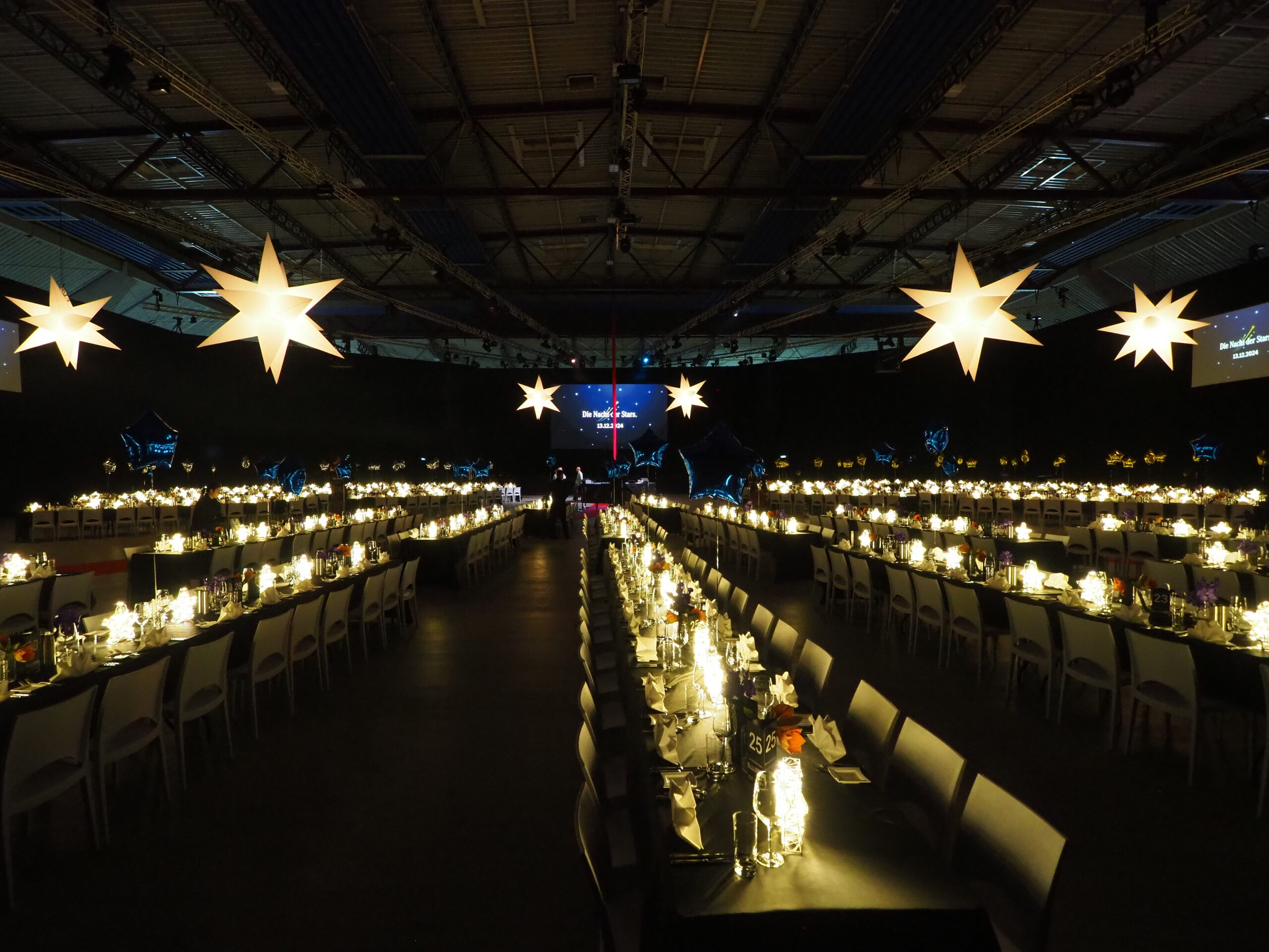 Die Nacht der Stars ist eine atemberaubende Jubilarfeier, die mit eleganter Pracht und einer Atmosphäre von Magie und Anerkennung erfüllt ist. Zu Beginn betreten die Jubilare den Raum auf eine ganz besondere Weise: Sie gehen durch einen Durchgang, welcher von Traversen gesäumt ist, von denen Sterne herab hängen. Jeder dieser Sterne trägt den Namen eines Jubilars, der in leuchtendem Licht erstrahlt und so eine ganz persönliche Ehrung des Erfolgs und der Errungenschaften darstellt.